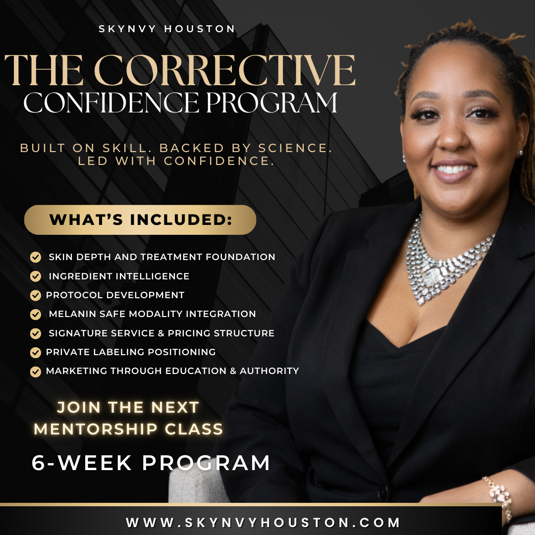 6-week corrective skincare mentorship for licensed estheticians treating melanin-rich skin. Learn skin depth, ingredients, modalities, pricing, and authority marketing.